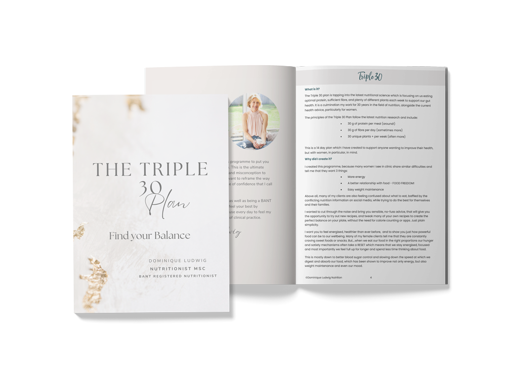 Triple 30 uses everyday, accessible foods, but I also include some fun, slightly different recipe ideas to get you thinking outside the box. You’ll get a full shopping list to make things easy. Triple 30 is a healthy Mediterranean style diet with plenty of colourful vegetables, lean meats and fish (very little red meat), fermented dairy (cheeses and yogurts), pulses, nuts, seeds, eggs and tofu with high quality carbohydrates.