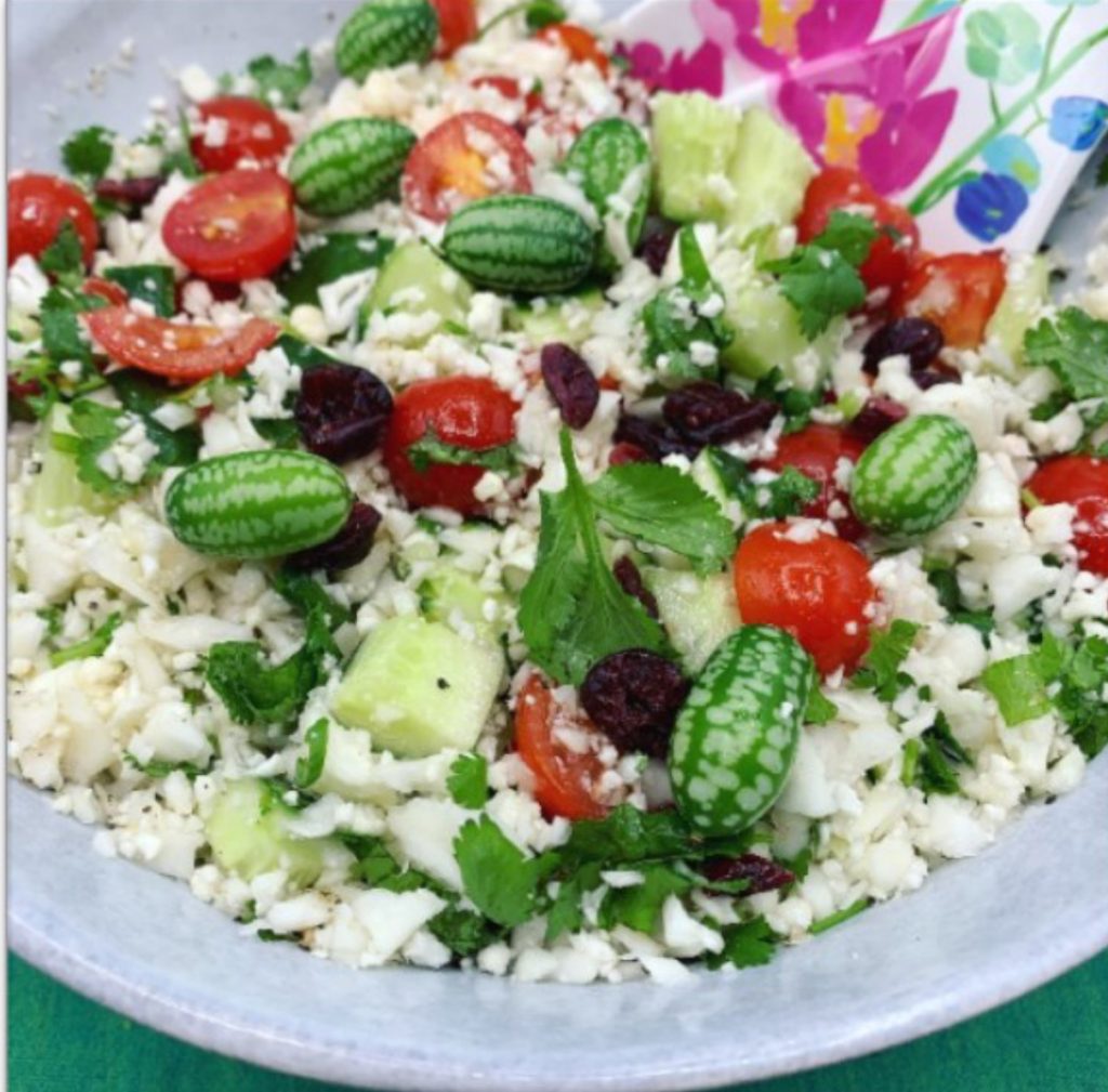 This is a great alternative to tabbouleh. Traditional tabbouleh can be very healthy, but when we are keeping meals well balanced for weight loss, cauliflower makes a useful substitute for bulgur wheat.