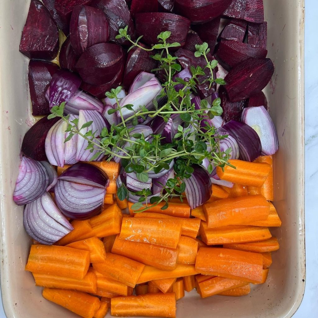 Having some roasted vegetables means that you can use them as a side dish to chicken, fish, cheese, eggs or tofu and they make a great base for salads. You can eat them at room temperature, heat them up or even add vegetable stock and turn them into a soup! They are so versatile. You can make an orange veg version, spiced cauliflower or the carrot, onion and beetroot that I use for one of the salads.