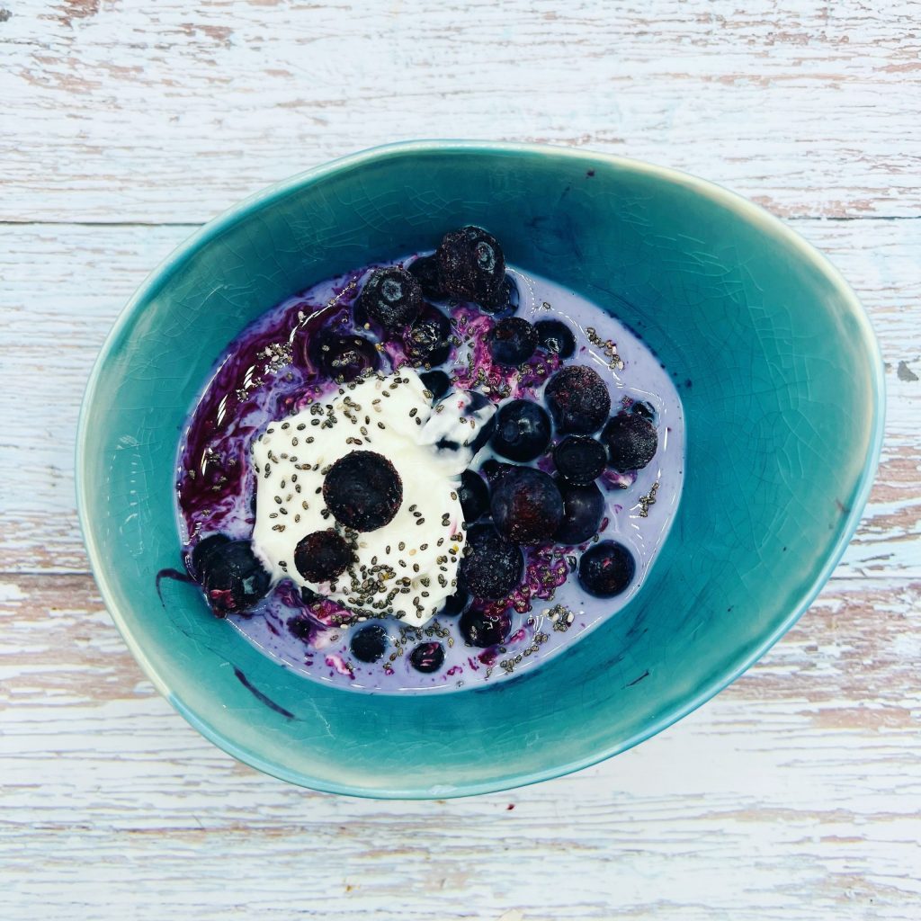 The ultimate gut-boosting breakfast! It contains the 4 P’s— PROTEIN, PROBIOTICS, PREBIOTICS and POLYPHENOLS. Probiotics are the LIVE bacteria in the yogurt. The prebiotics are the soluble fibre in the chia and flaxseeds and the Polyphenols are the vibrant colours found in the blueberries: all of which can have a positive influence on our microbiome. This is a great example of where we use half of one protein (yogurt) and half of another (seeds). I used soy milk with splash of kefir to loosen.