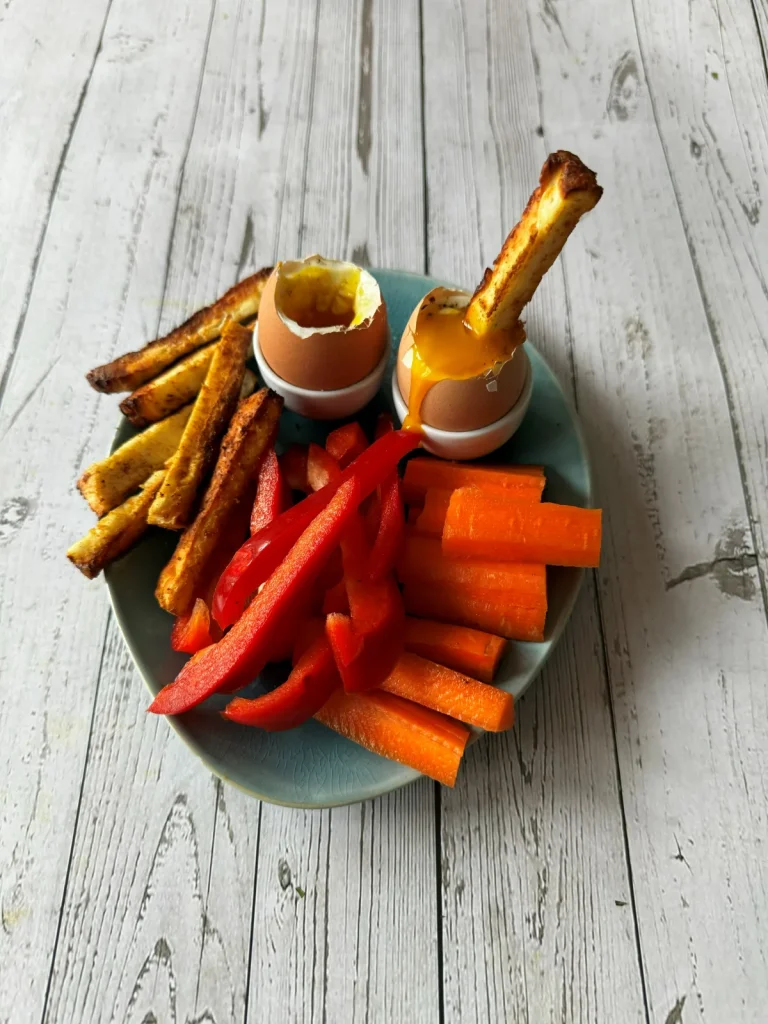 Swapping out the bread for halloumi soldiers is a great way of upping the protein and adding a delicious twist to your humble boiled eggs. You can top up the fibre by 5g with 100g wholegrain sourdough with an extra 9g protein if you like!