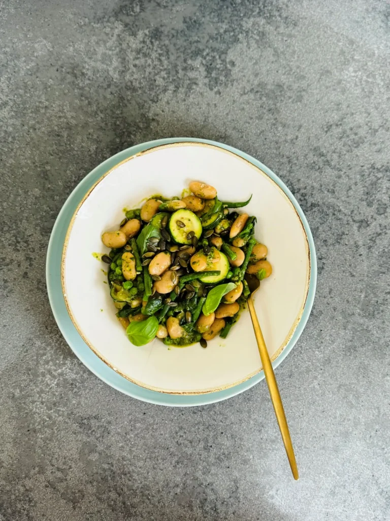 This is a fun take on pesto pasta, but I am using beans instead of pasta which makes it a very gut friendly recipe. Of course you can use red lentil, yellow pea or any other pasta if you choose instead. You can easily double up the quantities to make leftovers or to serve a family. You can use this idea with lots of your favourite pasta sauces, even my Puttanesca recipe from week 1.