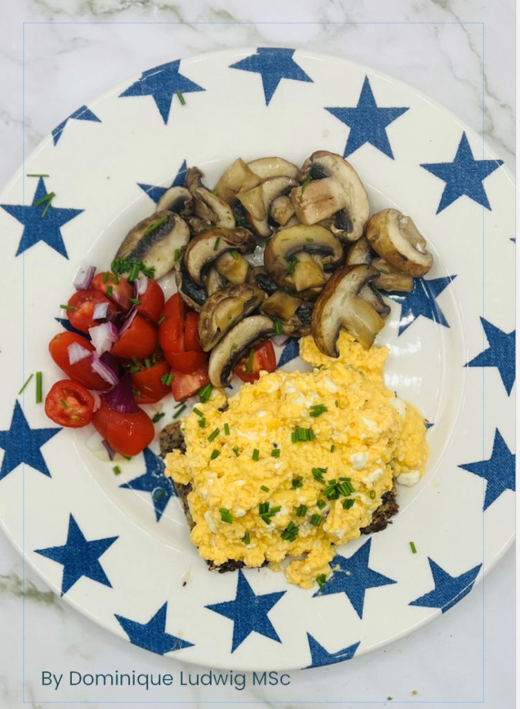 Two eggs on their own contain around 12g of protein and ideally we want to be aiming for 25g-30g per meal. By combining eggs with cottage cheese, we’re adding another 12g of protein to our plate. Include a big side of veggies (mushrooms, tomatoes, rocket, for example) and you will find yourself full up for longer and less likely to reach for the snack cupboard!