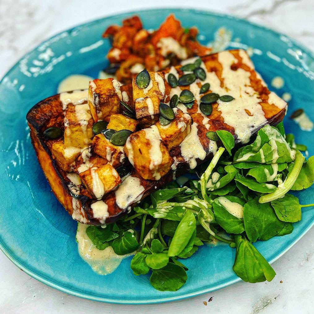 - Drizzle 2 tablespoons of the sauce over the tofu and butternut squash. Pop some rocket on the side. You could also add some kimchi.