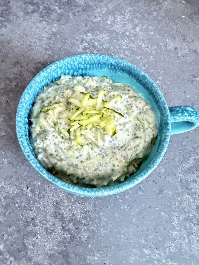 I love sneaking in vegetables into breakfast and this is no exception. Adding courgette or zucchini to your oats has a few benefits. Firstly it bulks up your meal, which means that you feel fuller for longer, and it also squeezes in a little more fibre. I have added an egg white to this to boost the protein. This is a big bowl of food believe me for 320kcals. If you don’t like the idea of using egg white (you can’t taste it, I promise), then add a little more Yogurt or Skyr at the end. I used oat bran which has more protein and fibre than regular oats and cooks in just a few minutes. You can also use regular rolled oats, if preferred.