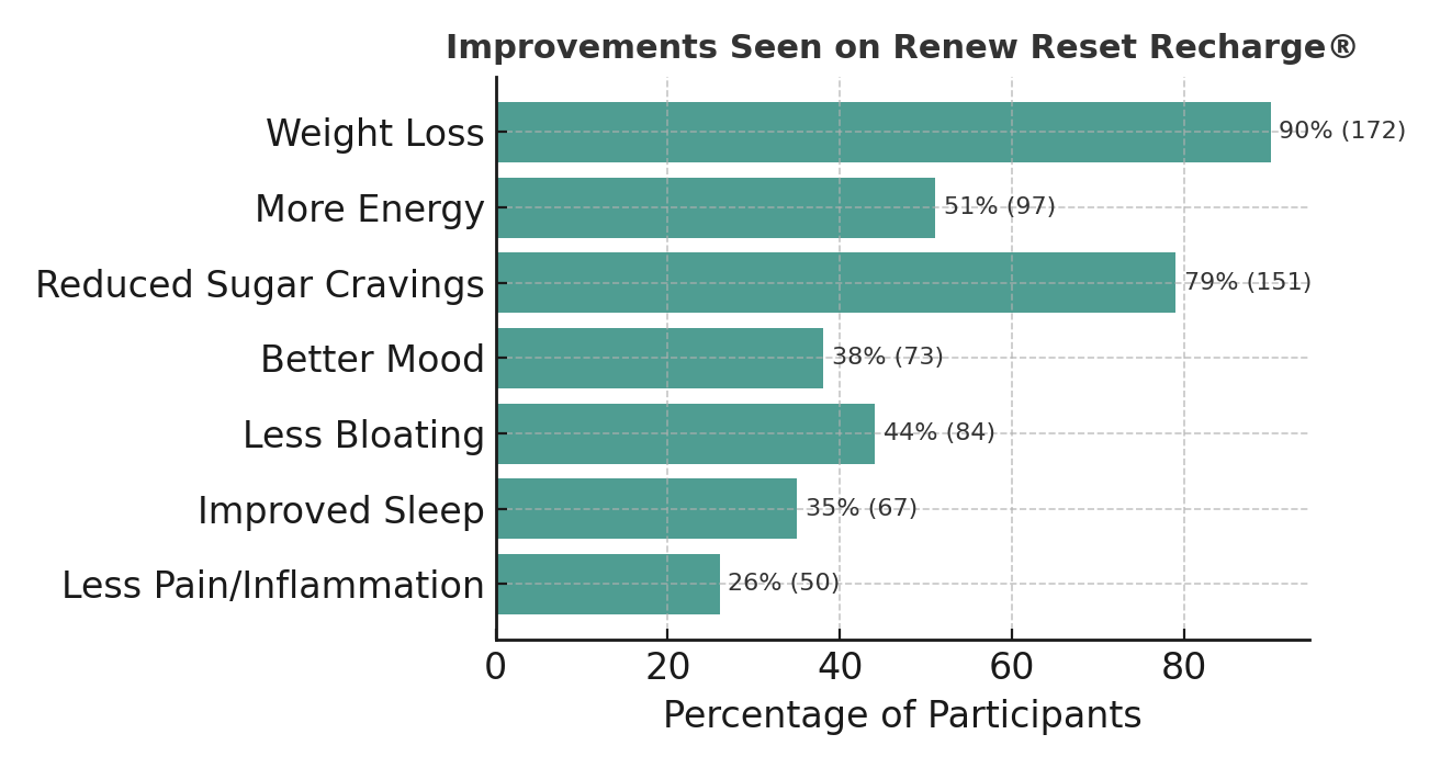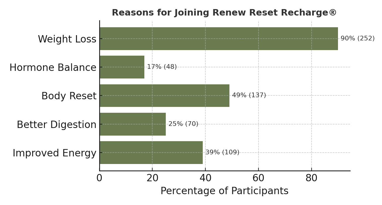These results reflect the experiences of participants who joined our Renew Reset Recharge® programme between November 2024 and July 2025 and who completed our questionnaire. Based on questionnaire responses, they highlight why people joined (n=280), the improvements they noticed (n=191), and their weight loss achievements after 28 days (n=191).  Results collected at the end of the 28 day programme.